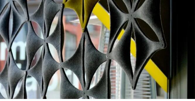 在室內(nèi)聲學設(shè)計中,無紡布越來越多地被用作可消音的“設(shè)計元素”。例如裝在墻面和/或頂棚上的單塊鑲嵌板、整面的墻面裝飾和吊頂、開放式辦公區(qū)域用的消音隔板,或者用毛氈制造的整件家具。